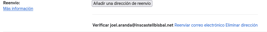 Afegim l’adreça de reenviament i posem l’adreça de correu electrònic a la qual vols redirigir els missatges. Després verifiquem l’adreça i guardem canvis.