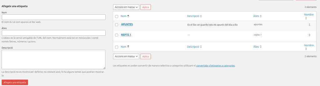 1. Entra al teu WordPress i dintre de entrades sortira un subapartat que posa “Etiquetes” clica.