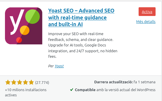 1.Primer anem a extensions i descarreguem el plugin “Yoast SEO”
