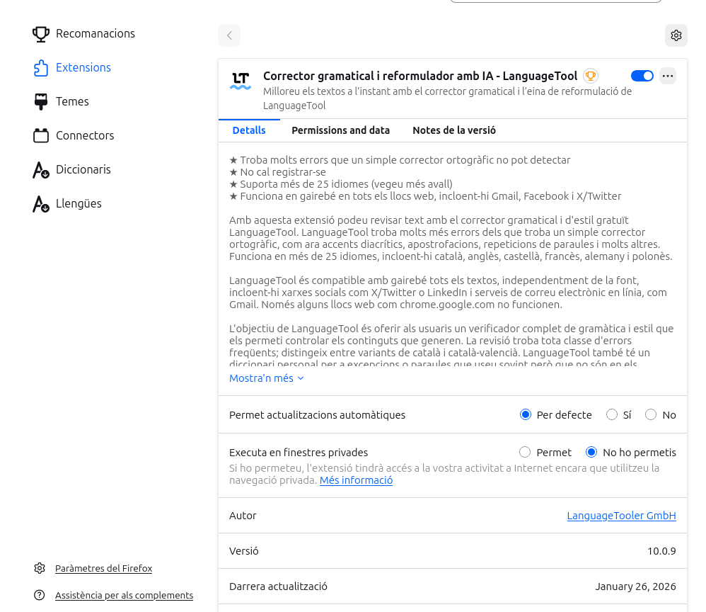- Eines utilitzades: S’ha emprat el corrector ortogràfic natiu del navegador Firefox (configurat en català) per a una detecció ràpida de faltes de picat i ortografia bàsica.