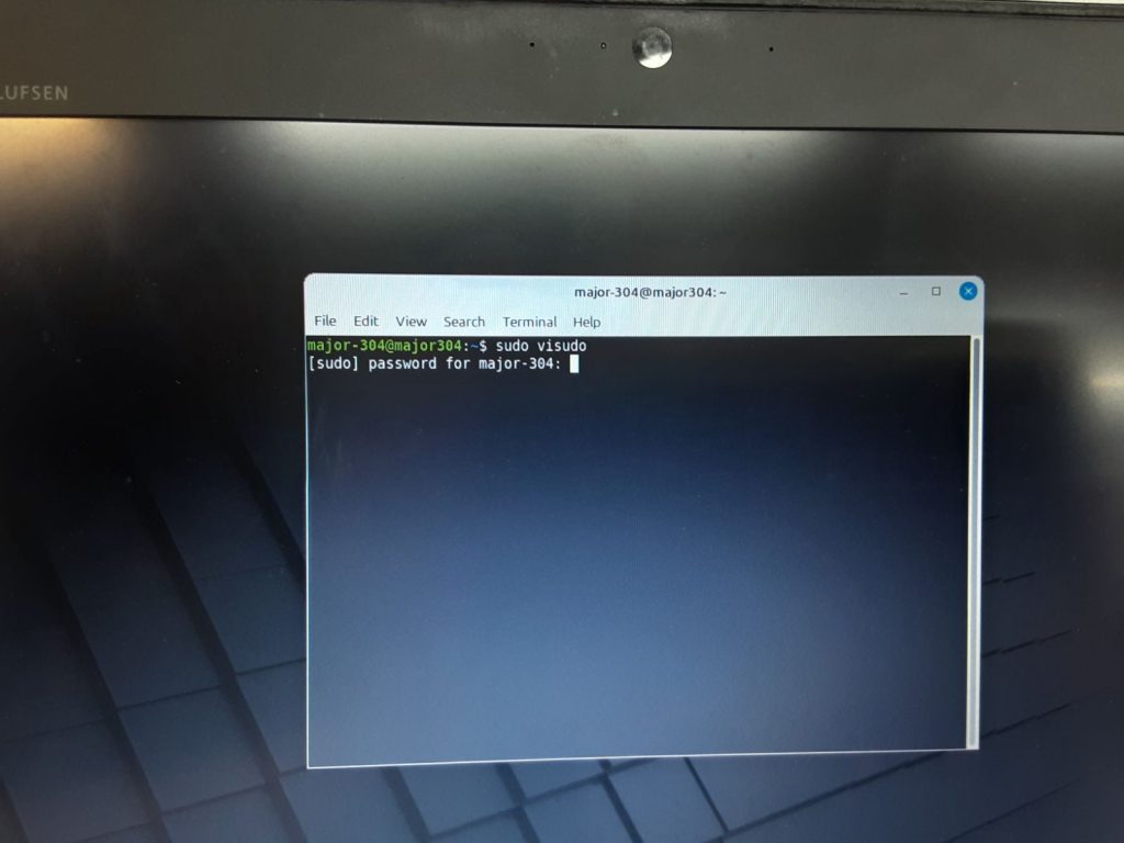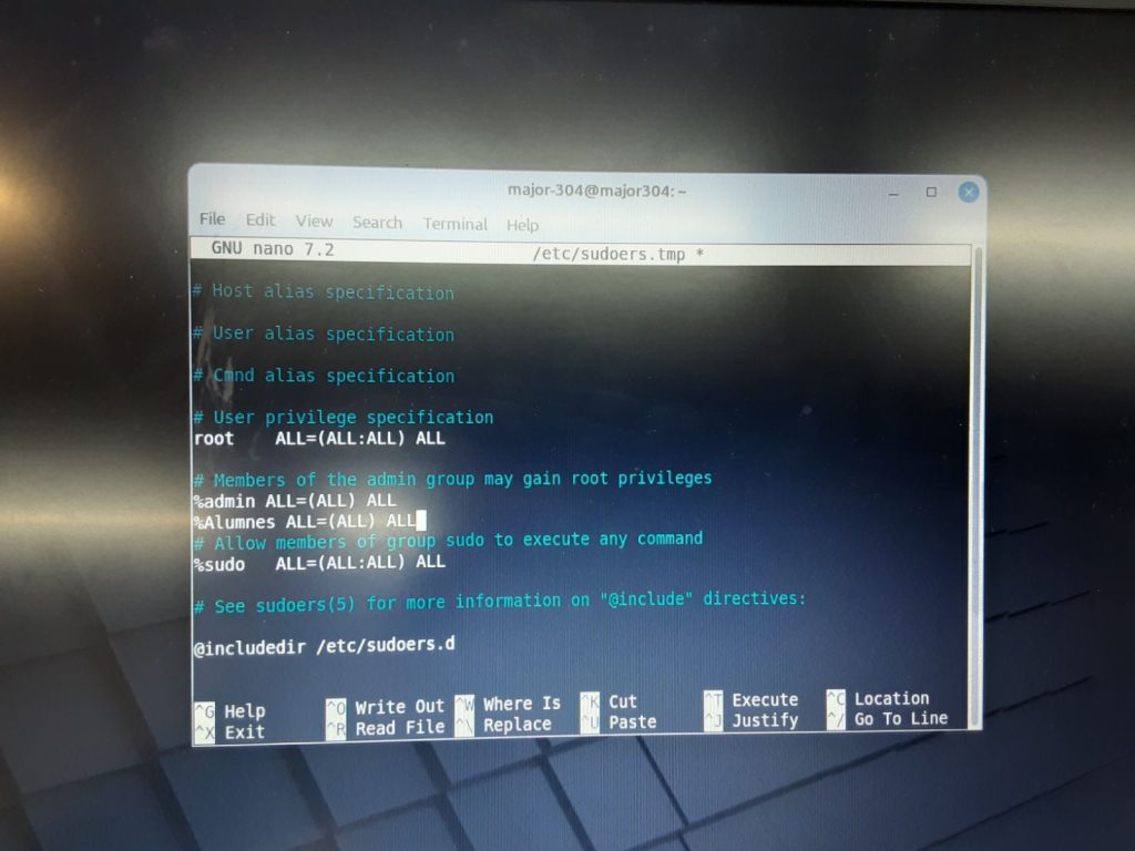 1. Primer hem configurat els usuaris de l’equip perquè tinguin tots els permisos perquè puguin executar totes les comandes com a administrador. Per fer això vam executar la comanda sudo visudo amb l’usuari major, fent això s’obre un codi que es pot modificar i serveix per donar permisos de sudo o grups o usuaris.