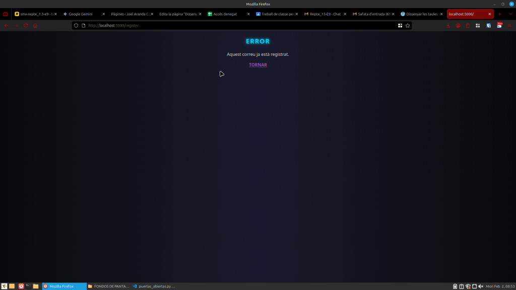 2. Captura 2: Validació d’Errors. (Intenta registrar dues vegades el mateix correu per mostrar el missatge d’error que vas programar).