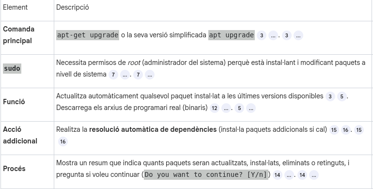 5. Ara fica el següent comand “sudo apt upgrade” per més informació del comand ves a baix de la pàgina sortirà el següent: